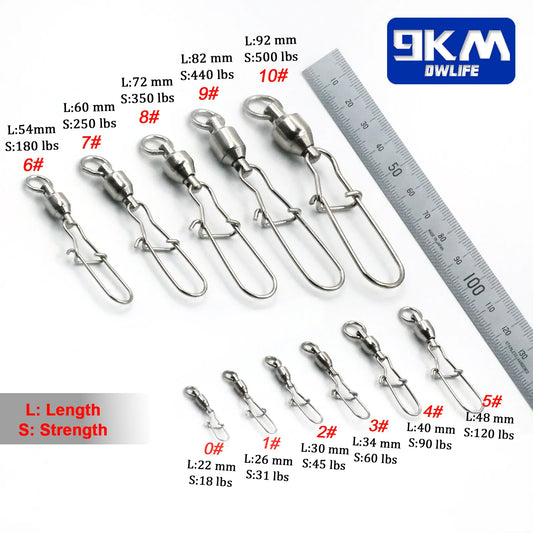 9KM 10Pcs Fishing Ball Bearing Swivels Duolock Snap Stainless Steel Fishing Connector Swivels with Crane Barrel Lure Fish Tackle