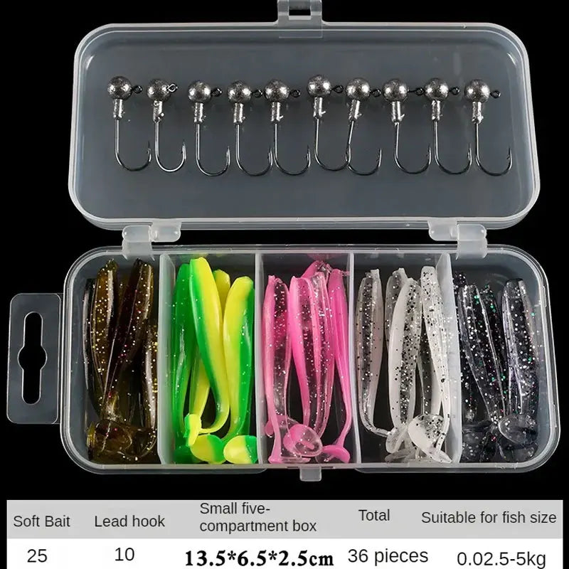 25 Pcs Lure Boxed Soft Bait Perch Warbler Fish Bait Soft Worms Threaded Curly Tail Maggot Bionic Bait Fake Baits Lead Head Hooks